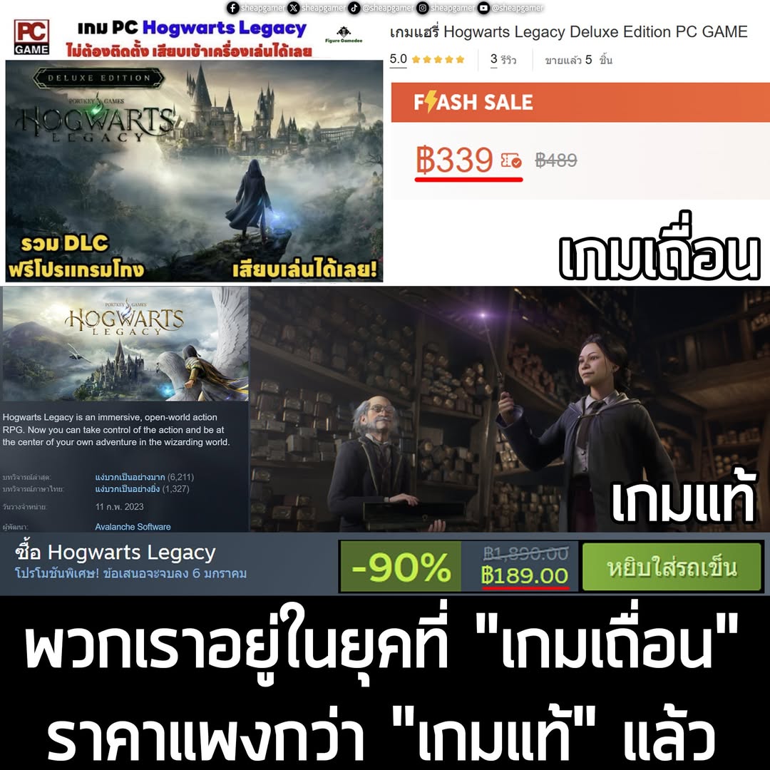 ในขณะที่เกมแท้ทุกวันนี้ รอเวลาสักหน่อย ก็มีช่วงลดราคาบ่อยๆ บางเกมแค่เดือนเดียวก็ลดราคาแล้ว บางเกมรอสัก 1 – 2 ปี ก็ลดถูกซะจนเหมือนได้เปล่า เช่น Hogwarts Legacy ที่ลด 90% บน Steam เหลือ 189 บาท และยังมีร้านค้าอื่นๆ ที่ขายถูกยิ่งกว่าอีก แล้วยังได้คีย์แท้ด้วย อย่างเช่นใน Loaded – https://loaded.pxf.io/LKLLdj ตอนนี้ลดเหลือ 173.29 บาท หรือถ้าไม่อยากซื้อ ก็ไปรอดู Epic Games Store แจกฟรีก็ได้ เกมแท้เหมือนกัน เล่นได้เหมือนกันเกือบจะเป๊ะๆ
