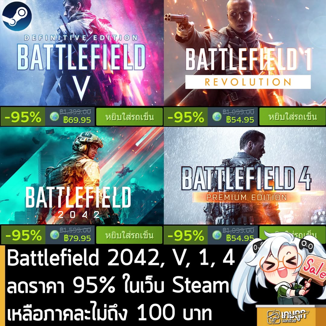 ลด 95% เท่าที่เคยถูกสุดของทั้ง 4 ภาคนี้ ส่วนภาค 6 ที่เป็นภาคล่าสุด ไม่ลด ส่วนตัวเกมก็ซีรีส์เกม FPS แบบผู้เล่นหลายคนในสนามรบขนาดใหญ่ ถ้าแนะนำตอนนี้ก็ V, 4 ,1 สามภาคนี้ คือดีจริง จำนวนคนเล่นพร้อมกันก็ถือว่าพอใช้ได้ ส่วน 2042 เปิดตัวห่วย แต่อัปเดตจนดีขึ้น ในระดับที่พอใช้ได้แล้ว