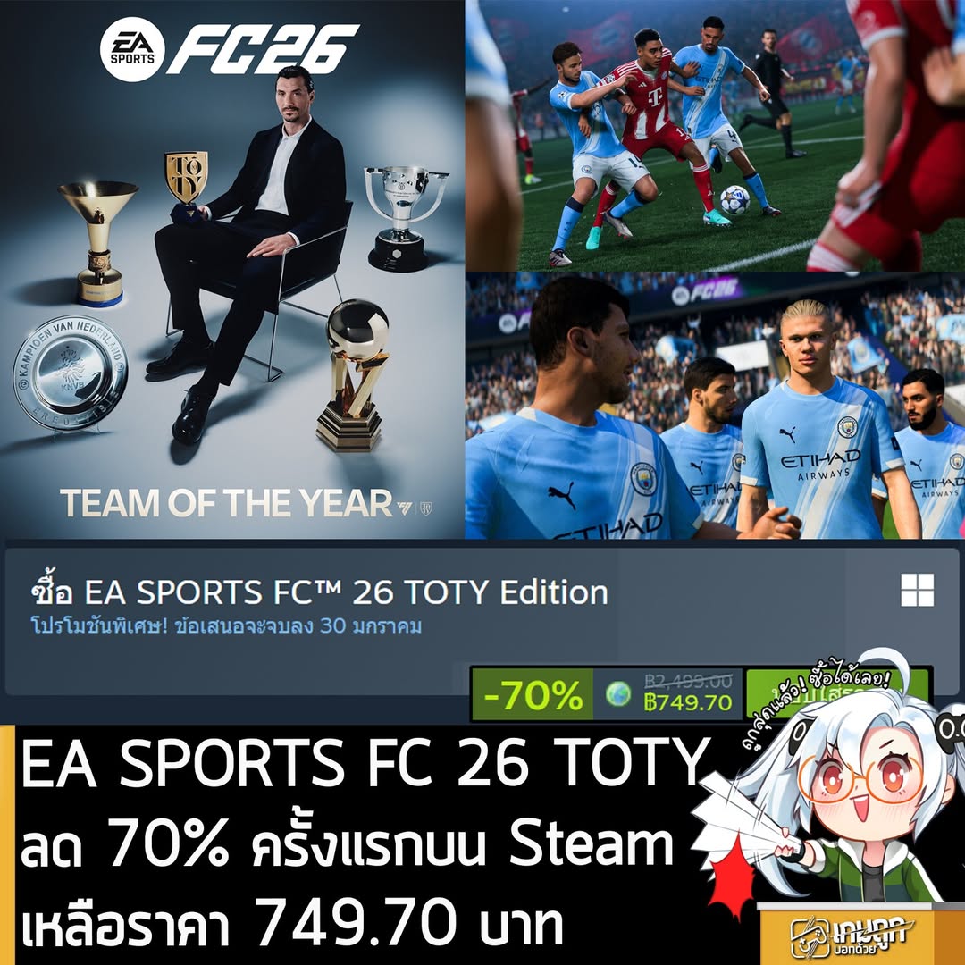 ลด 70% ครั้งแรกของตัวเกมแบบ TOTY Edition (ได้ตัวเกมหลัก พร้อม 5,000 Season Points, Gold Team of the Year Nominees Starting XI Pack และ 2025 Highlights 1 of 5 player item picks x3) ส่วนตัวเกมก็ ภาคล่าสุดของเกมฟุตบอลเรือธงจาก EA เกมหมาๆ ด่ากันทุกปี แต่ก็ซื้อทุกปี