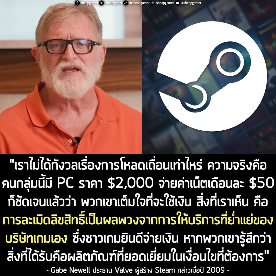 คำพูดสุดอมตะของคุณ Gabe Newell ผู้ก่อตั้ง Valve และเป็นผู้สร้าง Steam กลับมาเป็นกระแสอีกครั้ง หลังจากผ่านไป 16 ปี อันเนื่องมาจากช่อง YouTube ที่มีผู้ติดตามเพียง 750 คน ลงคลิปวิดีโอความละเอียด 180p ที่ คุณ Newell อธิบายอย่างกระชับว่า การละเมิดลิขสิทธิ์ทำไมถึงมีปัญหามาจากเรื่องบริการ จากการให้สัมภาษณ์ ในรายการ ABC Good Game เมื่อปี 2009 (ซีซัน 5 ตอนที่ 24) และคลิปนี้ทำให้เราได้เห็นว่า ท่ามกลางปัญหาที่แพลตฟอร์มต่างๆ ค่อยๆ บริการห่วยแตกลง ที่เรากำลังเห็นหนักขึ้นเรื่อยๆ ในปี 2026 ทำให้ข้อโต้แย้งของคุณ Newell ที่ใช้ได้ในปี 2009 ก็ดูเหมือนจะยังคงใช้ได้ในยุคนี้