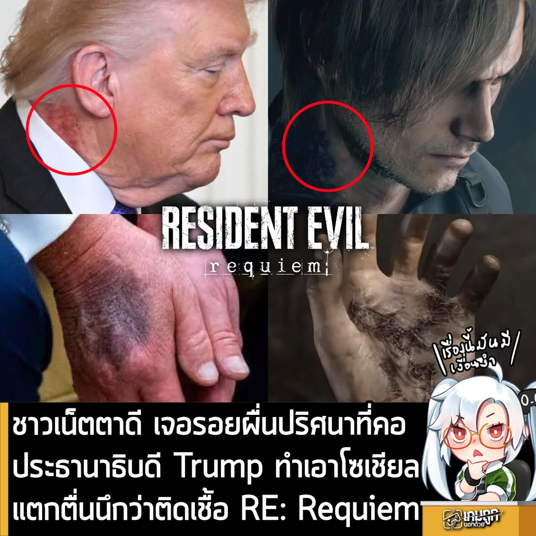 เมื่อวันจันทร์ที่ผ่านมา ประธานาธิบดี Donald Trump ได้ปรากฏตัวในพิธีมอบเหรียญ Medal of Honor ที่ทำเนียบขาว ซึ่งก็ดูไม่มีอะไรผิดปกติ จนกระทั่งมีคนสังเกตว่า ประธานาธิบดี Trump มีผื่นแดงขนาดใหญ่บริเวณลำคอ ซึ่งมีลักษณะผิวลอก เป็นตุ่มนูน และดูเหมือนจะมีพุพองเล็กน้อย หลังจากภาพนี้ถูกเผยแพร่ออกไป ชาวเน็ตก็พากันเอาไปเปรียบเทียบทันทีว่ารอยแดงนี้ดูเหมือนการติดเชื้อในเกม Resident Evil หรือ The Last of Us ชัดๆ โดยมีคนเอาแผลนี้ไปเปรียบเทียบกับแผลของ Leon ใน Resident Evil: Requiem ที่เพิ่งวางจำหน่ายด้วย