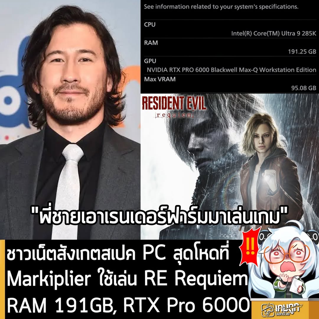 โดยสเปค PC ของ Markiplier คือ Intel Core Ultra 9 285K RAM 181 GB และการ์ดจอ Nvidia RTX Pro 6000 Blackwell Max-Q Workstation Edition ที่มี VRAM มากถึง 95 GB ซึ่งมีคนไปตรวจสอบราคาพบว่า การ์ดจอรุ่นดังกล่าว ใบเดียวก็มีราคาสูงกว่า $10,000 หรือเกือบ 320,000 บาทไทยเลยทีเดียว