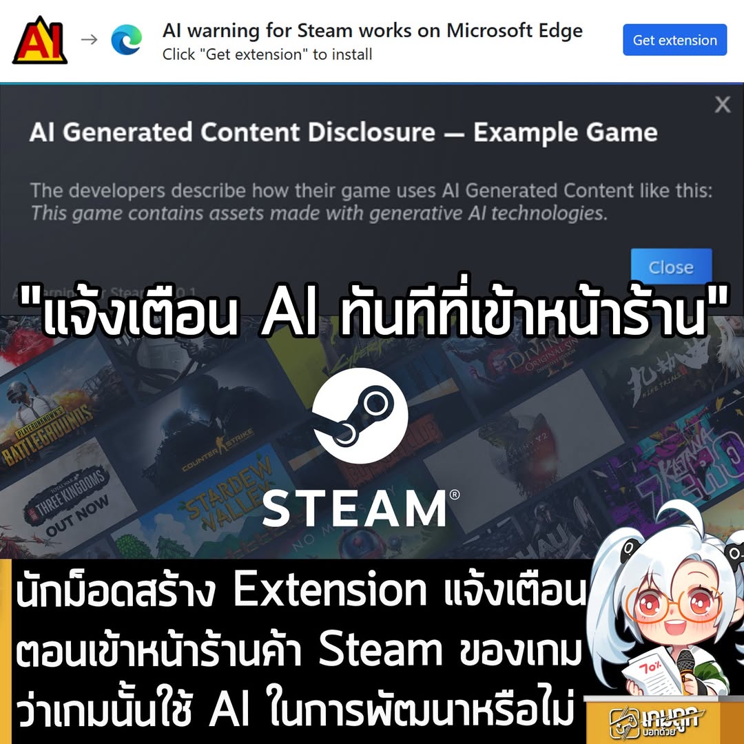นักม็อดรายหนึ่ง สร้าง Extension บน Firefox และ Chrome (ใช้กับ Edge ได้ด้วย) ที่จะแจ้งเตือนว่า เกมใดบน Steam ที่ใช้ AI ในการพัฒนา “ตั้งแต่เริ่มเข้าหน้าร้านค้า” พร้อมเปิดให้ใช้งานแล้ว