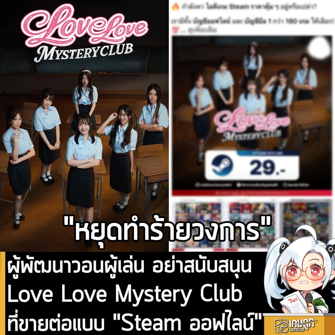 คุณแซ็ค ศรุต ทับลอย ผู้พัฒนา Love Love Mystery Club เกมจีบสาวกึ่งสยองขวัญในรูปแบบ Full-Motion Video ที่เพิ่งวางจำหน่ายบน Steam เมื่อวันที่ 9 ม.ค. ที่ผ่านมา ออกมาประกาศขอความร่วมมือผู้เล่นทุกคน โปรดอย่าสนับสนุน ผู้ที่นำ Love Love Mystery Club ไปจำหน่ายต่อในรูปแบบของ “Steam Offline” พร้อมแจ้งเตือนผู้ที่ละเมิดลิขสิทธิ์ดังกล่าว ให้ยุติการจัดจำหน่ายโดยทันที หากไม่หยุดทำการหรือพบการกระทำซ้ำ จะดำเนินคดีตามกฎหมายต่อไป