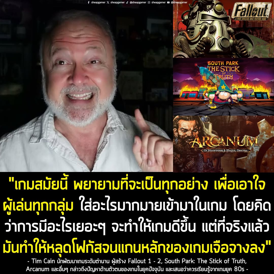 คุณ Cain อธิบายถึงเกมยุคปัจจุบันที่กำลังประสบปัญหาด้านตัวตนของตัวเอง พร้อมระบุว่า เกมเก่าๆ จะมีจุดโฟกัสที่ชัดเจนกว่า เพราะยุคนั้น พวกเขาไม่มีตัวเลือกอื่น