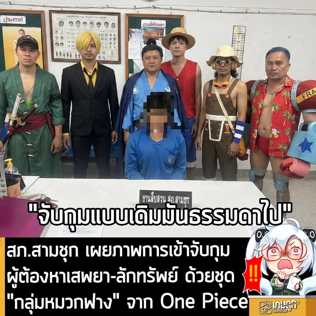 [News] สภ.สามชุก เผยภาพการเข้าจับกุมผู้ต้องหาเสพยา-ลักทรัพย์ ด้วยชุด “กลุ่มหมวกฟาง” จาก One Piece