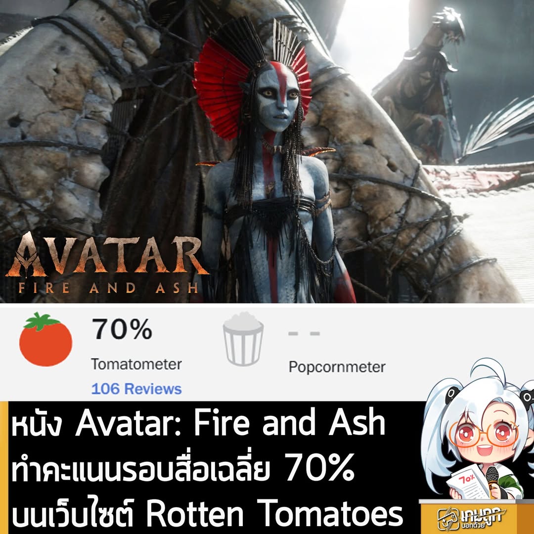 ในตอนนี้ คะแนนรอบสื่อของ Avatar: Fire and Ash ภาคที่ 3 ของภาพยนตร์ชุด Avatar จากผู้กำกับ James Cameron ก็ออกมาแล้วนะครัช โดยได้ไป 70% บนเว็บไซต์ Rotten Tomatoes จากสื่อรวม 106 สำนัก แม้ว่าน้อยที่สุดกว่าทุกภาค แต่ก็ยังถือว่าคะแนนสูงเอาเรื่องเลยทีเดียว
