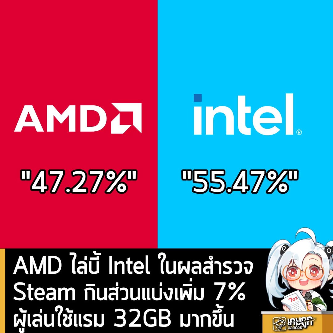 [News] AMD ไล่บี้ Intel ในผลสำรวจ Steam กินส่วนแบ่งเพิ่ม 7% ผู้เล่นใช้แรม 32GB มากขึ้น