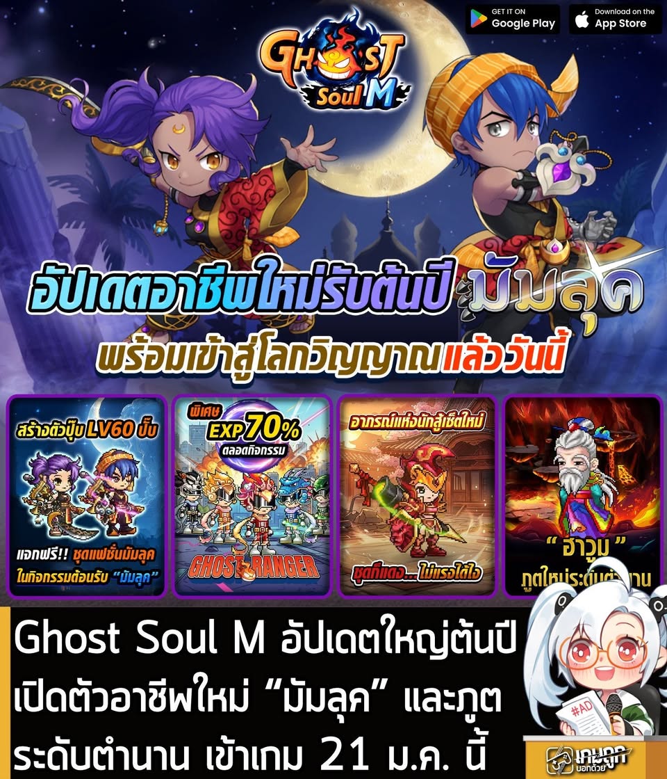Ghost Soul M อัพเดทใหญ่ ปล่อยอาชีพใหม่ตัวโหด สู่โลกวิญญาณ! “มัมลุค” นักรบผู้เชี่ยวชาญการต่อสู้ทุกระยะ มาพร้อมภูตตัวใหม่ระดับ Legendary “ฮาวูมู” และกิจกรรมต้อนรับ “มัมลุค” ช่วยเลเวลอัพแบบจัดเต็ม มีแจกชุดแฟชั่นเฉพาะ “มัมลุค” และอัพเดท “อาภรณ์แห่งนักสู้” เซ็ตใหม่ พร้อมฟาร์มกันเพลินๆ ทั้งวันทั้งคืนกับ บัฟ EXP+ 70% ทั้งเซิร์ฟ และยังมีกิจกรรมอื่นๆ อีกมากมาย เจอกัน 21 มกราคมนี้!!