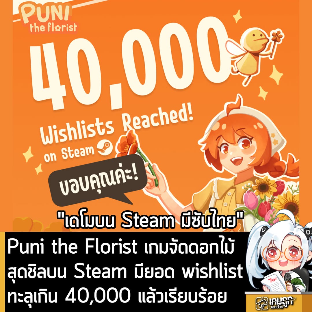Puni the Florist เกมจำลองร้านดอกไม้ จาก Earthquack Games ผู้พัฒนาชาวไทย ตอนนี้มียอด Wishlists บน Steam ทะลุไปมากถึง 40,000 คนแล้ว ซึ่งถือเป็นความสำเร็จที่สูงมากๆ ภายในเวลาไม่ถึง 1 ปี นับจากเปิดตัวไปเมื่อเดือน มี.ค. โดย Puni the Floris ได้มีโอกาสไปออกงาน SXSW Sydney 2025 และ gamescom asia x TGS 2025 ในบูธ Thai Pavillion ที่ผ่านมา และตอนนี้ Puni the Florist ก็กำลังเข้าร่วมงาน Steam Event: Cozy Quest และ Build, Design, Chill อยู่ด้วยเช่นกัน ทางเพจเกมถูกบอกด้วย ต้องขอแสดงความยินดีกับทีมพัฒนาด้วยมากๆครับ