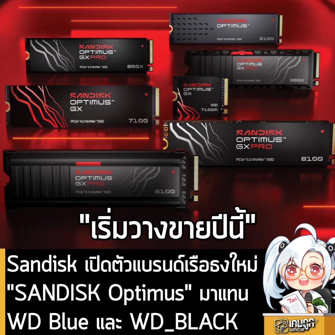 SANDISK Optimus GX สำหรับกลุ่มที่เน้นประสิทธิภาพสูงขึ้นมา เน้นการเล่นเกมอย่างไร้ขีดจำกัด มอบเวลาโหลดที่รวดเร็วและความจุที่เพิ่มขึ้น โดยจะเข้ามาแทนที่แบรนด์ WD_BLACK™ ในระดับเริ่มต้นถึงระดับกลาง เพื่อให้เกมเมอร์เข้าถึงประสบการณ์การเล่นเกมที่ลื่นไหลและประหยัดพลังงานได้ดีกว่าเดิม