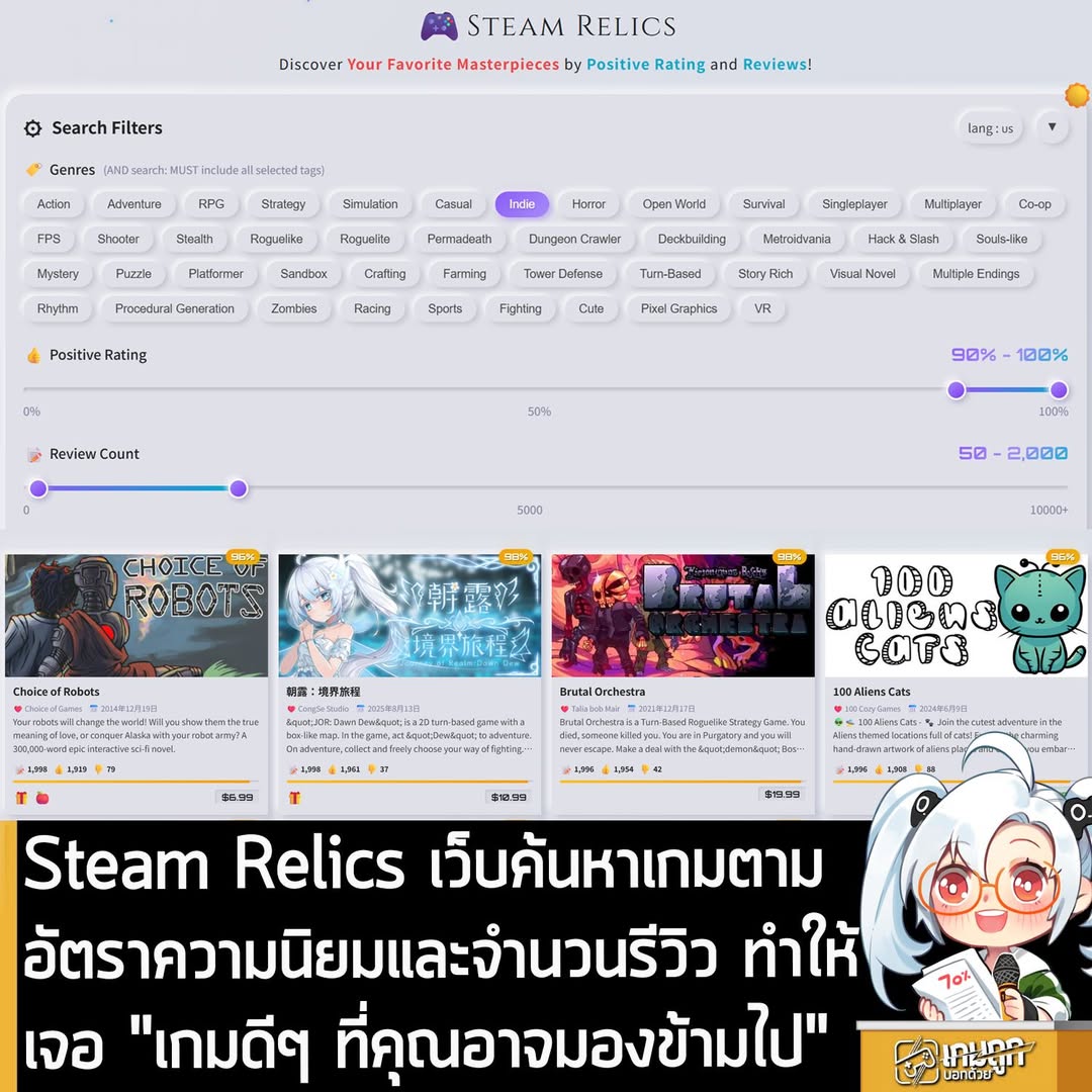 [News] Steam Relics เว็บค้นหาเกมตามอัตราความนิยมและจำนวนรีวิว ทำให้เจอ "เกมดีๆ ที่คุณอาจมองข้ามไป" . นักพัฒนาอิสระนามว่า…