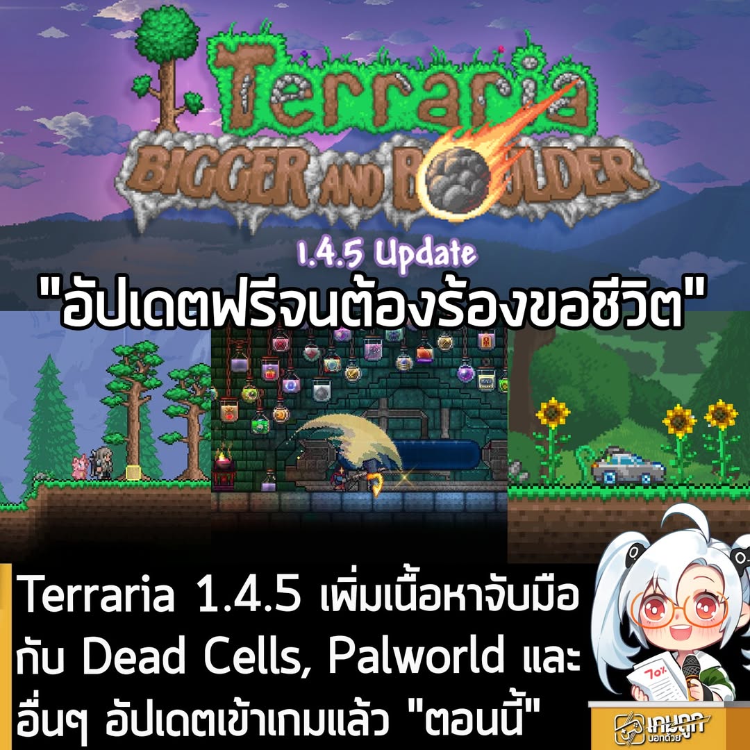 ในตอนนี้ Terraria ก็ได้อัปเดตเวอร์ชัน 1.4.5 ในชื่อ Bigger & Boulder บนทุกแพลตฟอร์มแล้ว (ยกเว้นเวอร์ชันมือถือจีน) โดยผู้ที่ลงตัวเกมไว้ จะได้รับอัปเดตอัตโนมัติ เมื่ออัปเดตเสร็จก็เข้าเกมได้เลย