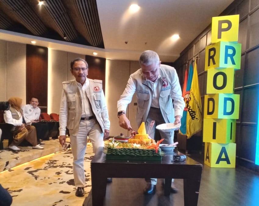 Peringatan HUT Ke-37 Yastroki ditandai pemotongan tumpeng Bersama Ketua Umum Mayjen TNI (Purn) Tugas Ratmono Ke Prodia Tower, Kramat Raya, Jakarta Pusat, Minggu (18/1/2026). Foto: Ist