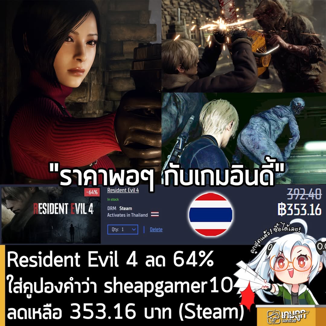 ใน Steam โซนไทยตอน Winter Sale ลดราคา 60% เหลือ 436 บาท ครั้งนี้ของ Gamersgate ถูกกว่าเยอะ และถูกที่สุดเท่าที่เคยมีมา ส่วนตัวเกมก็เวอร์ชันรีเมคของ Resident Evil 4 ที่ยกระดับให้ดีขึ้นกว่าต้นฉบับในหลายๆ ด้าน ทั้งกราฟิกจากขุมพลัง RE Engine และเกมเพลย์ที่ดีขึ้นกว่าเดิม เนื้อหาให้เล่นเยอะ คุณค่าในการเล่นซ้ำที่มากไม่แพ้ภาคต้นฉบับ ตัวเกมมีทั้งม็อดภาษาไทยและม็อดเสียงพากย์ไทย ไปโหลดได้ที่เพจ มาม่าทอด หรือ Noob-Translator ส่วนใครสนใจก็ลองโหลดเดโมมาทดลองเล่นดูก่อนได้ที่หน้าร้านค้า Steam