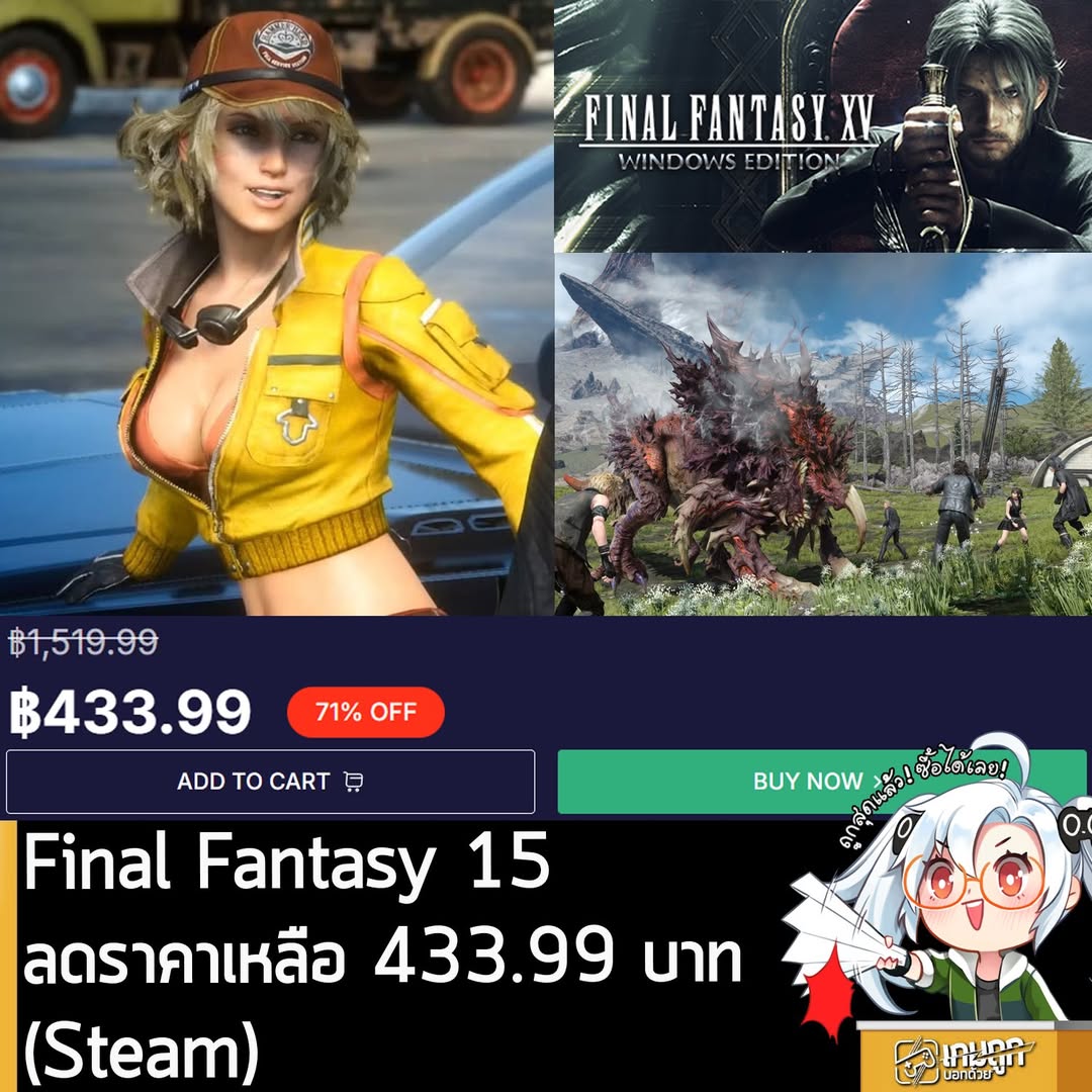 ใน Steam โซนไทย ปกติ ลด 60% เหลือ 675 บาท ครั้งนี้ของ cdkeys ถูกกว่าเยอะเลย ส่วนตัวเกมก็ภาคหลักลำดับที่ 15 ของซีรีส์ Final Fantasy ที่เปิดโอกาสให้คุณออกสำรวจโลกเปิดกว้างที่มีกิจกรรมอะไรให้ทำเยอะมากๆ ส่วนช่วงท้ายจะเป็นเส้นตรง ถึงแม้ว่าช่วงหลังๆ ของเกมจะค่อนข้างเผา แต่ราคานี้ก็ถือว่าคุ้มแล้ว ใครสนใจก็ลองไปโหลดเดโมมาลองเล่นก่อนตัดสินใจซื้อได้ที่ร้านค้า Steam