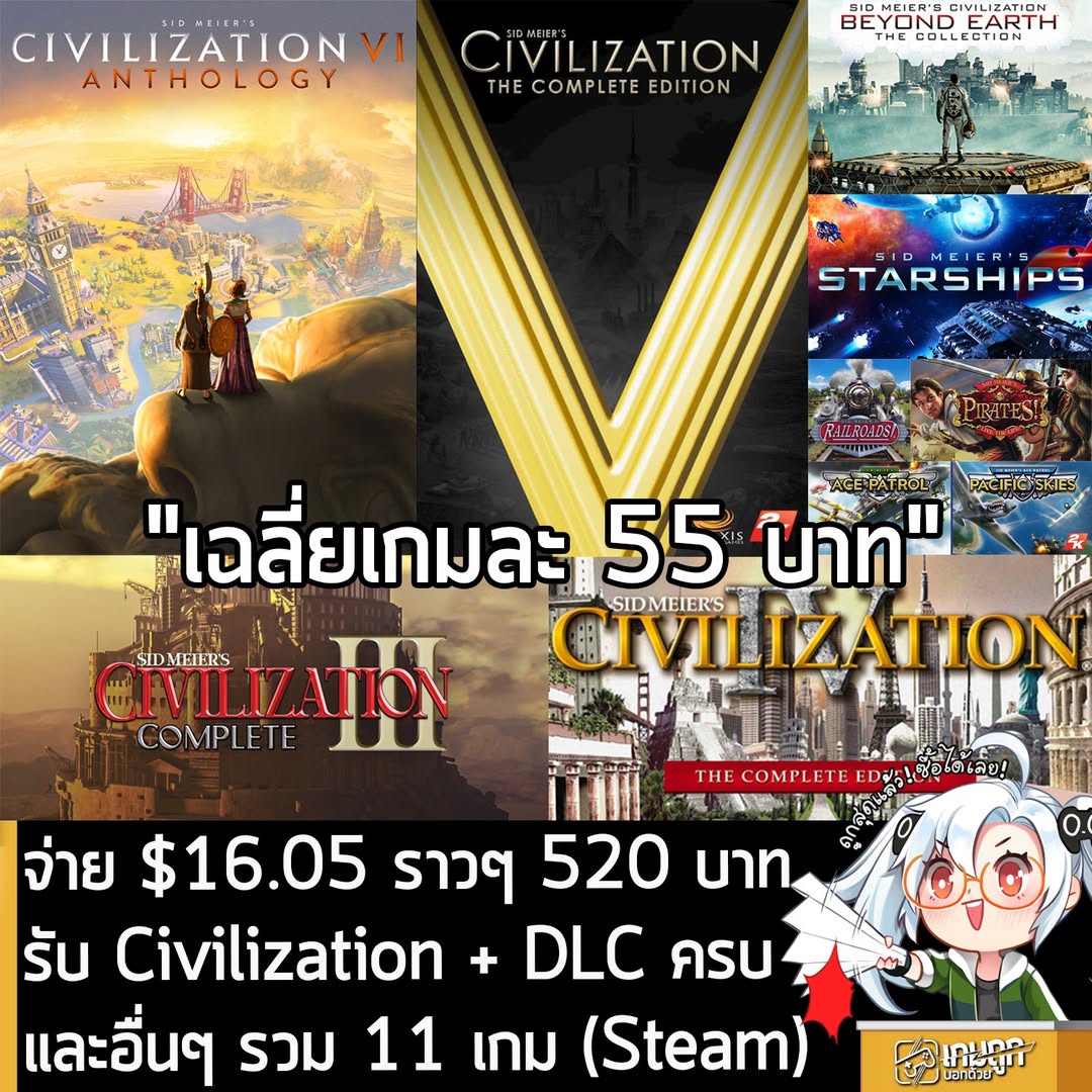 แพ็คสุดคุ้มรวมทุกเกมดูดเวลาของ Sid Meier ทุกเกมบน Steam เจ๋งสุดคือ Civilization 6 ได้ครบทุก DLC เท่า Anthology ราคาถูกกว่าตอนที่วางขายเมื่อปี 2024 ด้วย เฉลี่ยเกมละ 50 กว่าบาท แต่ได้ครบขนาดนี้อย่างคุ้ม ใครยังไม่มีสักเกมและชอบเกมของ Sid Meier ก็จัดกันไปได้เลย