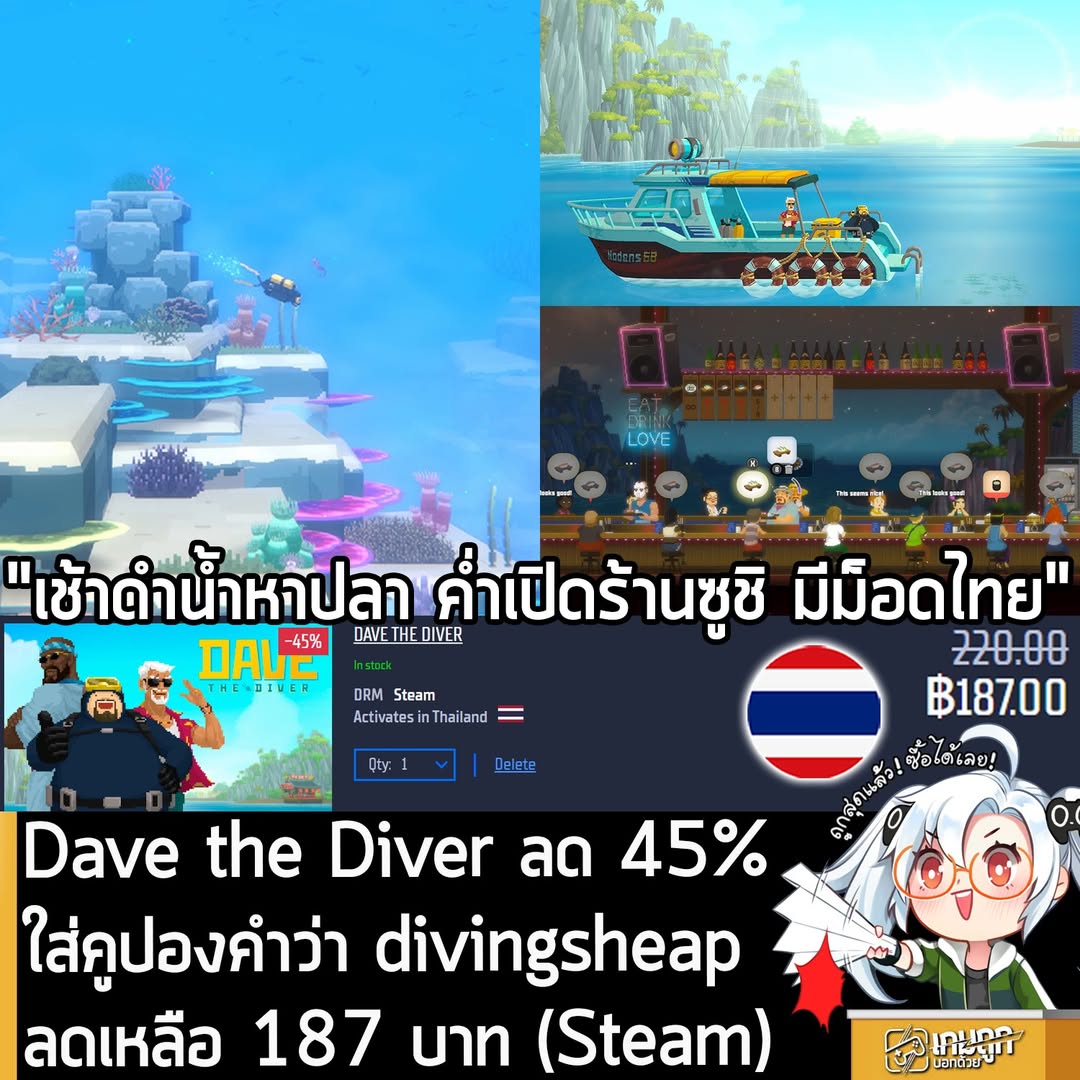 ใน Steam โซนไทย เคยถูกสุดที่ลด 45% เหลือ 220 บาท ครั้งนี้ของ Gamersgate ถูกกว่าเยอะเลย ส่วนตัวเกมก็เกมเล่นเป็นนักประดาน้ำหุ่นหมี ตอนกลางวันดำน้ำในทะเล ออกหาปลา ล่าวัตถุดิบ ทำภารกิจต่างๆ ตกกลางคืนก็ไปทำงานเป็นเด็กเสิร์ฟขายซูชิ ให้บริการลูกค้า เสิร์ฟเบียร์ ทำงานจิปาถะ เก็บเงินไว้อัปเกรดของ ระหว่างนั้นจะมีเนื้อเรื่องต่างๆ ให้ทำมากมาย ภารกิจยิบย่อยเช่น สะสมการ์ดปลาให้ครบ มินิเกมในมือถือ เกมจับจังหวะดนตรี ทำอาหารเอาใจแขก VIP เพื่อเพิ่มแรงก์ร้านค้า ลงทะเลปราบบอสขนาดใหญ่ และอื่นๆ รวมถึงเนื้อหาคอนเทนต์ที่เป็นการจับมือกับเกมอินดี้อื่นๆ อย่าง DREDGE และ Godzilla และปีนี้ก็กำลังจะมี In the Jungle DLC เพิ่มหมู่บ้านใหม่และทะเลสาบน้ำจืดขนาดใหญ่ด้วย ราคานี้คุ้มมาก ตัวเกมมีม็อดภาษาไทยด้วย ใครยังไม่เคยเล่นมาก่อนก็จัดไปตามระเบียบ