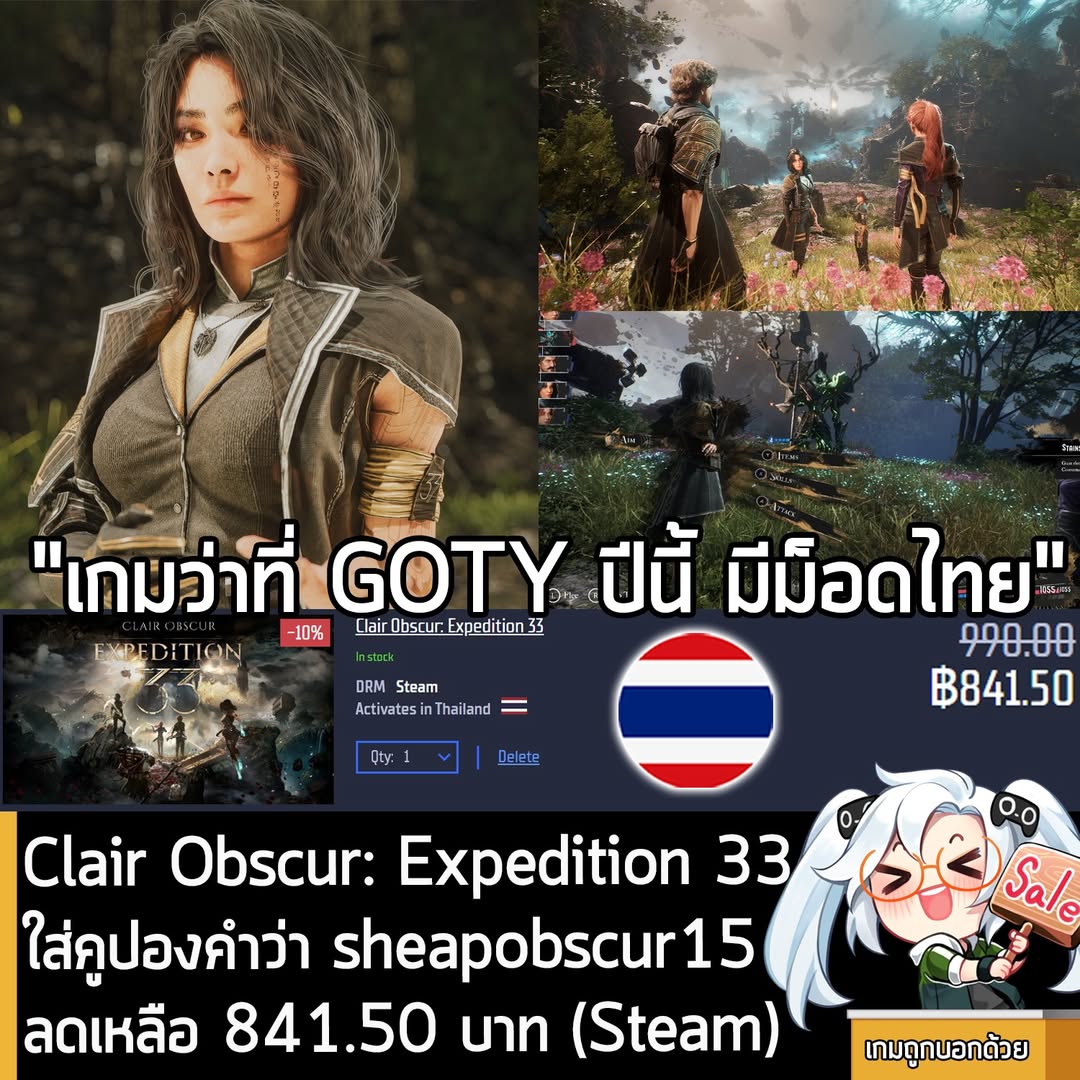 Clair Obscur: Expedition 33 กำลังลดราคา 10% ใน Gamersgate เหลือราคา 990 บาท ใส่คูปองคำว่า SHEAPOBSCUR15 ลดได้อีก 15% เหลือ 841.50 บาท (Steam)