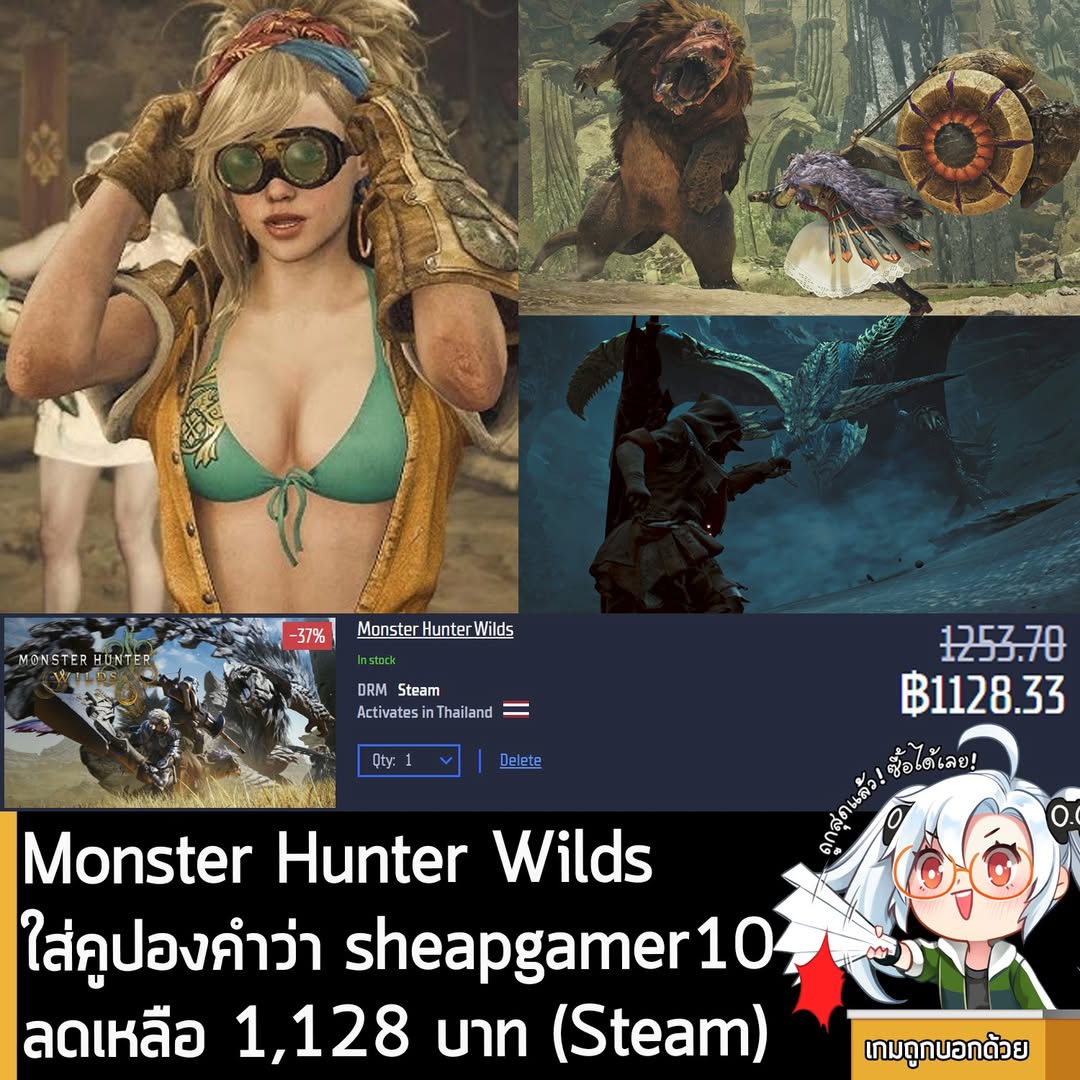 Monster Hunter Wilds กำลังลดราคา 37% ใน Gamersgate เหลือ 1,253.70 บาท ใส่คูปองคำว่า sheapgamer10 ลดได้อีก 10% เหลือ 1,128.33 บาท (Steam)