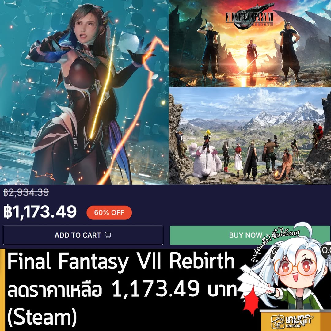 ใน Steam โซนไทยเคยถูกสุดที่ลด 40% เหลือ 1,374 บาท ครั้งนี้ของ Loaded ถูกกว่าเยอะเลย และถูกที่สุดเท่าที่เคยมีมา ส่วนตัวเกมก็ภาคต่อ Final Fantasy 7 เวอร์ชัน Remake ที่เล่าเรื่องราวต่อจากภาคแรก ยกระดับระบบการเล่นให้ดีขึ้น พร้อมด้วยมินิเกมมากมาย กับเนื้อหาคอนเทนต์อัดแน่นทั้งเกม รวมถึงมีม็อดดีๆ เพียบ ราคานี้ถือว่าคุ้มมากๆ