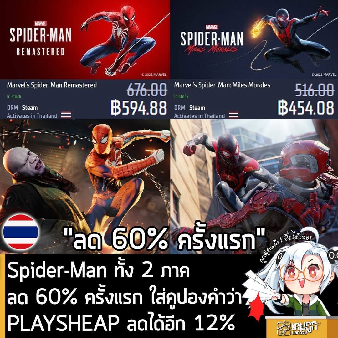 ลด 60% ครั้งแรก แต่ถูกกว่าบน Steam โซนไทยด้วยคูปองลดอีก 12% และเป็นการลดราคาต่ำกว่า 600 บาทเป็นครั้งแรกของ Spider-Man Remastered ส่วนตัวเกมก็เกมแอ็กชันผจญภัยของเพื่อนบ้านแสนดีสไปเดอร์แมน ภาคแรกมีอะไรให้ทำเยอะมาก เนื้อเรื่องเข้มข้น ระบบการต่อสู้สนุกมากๆ ส่วนภาค Miles Morales เปลี่ยนมาเล่นเป็นอีกตัวละคร เนื้อเรื่องอาจจะสั้นกว่าภาคแรก แต่ระบบต่างๆ ดีขึ้น สะใจขึ้น ทั้ง 2 ภาคมีม็อดซับไตเติลภาษาไทยแล้ว ไปโหลดได้ที่เพจ Spider-Translate ส่วนภาค 2 ไม่ต้องใช้ม็อด เพราะมีซับภาษาไทยในเกมแล้ว