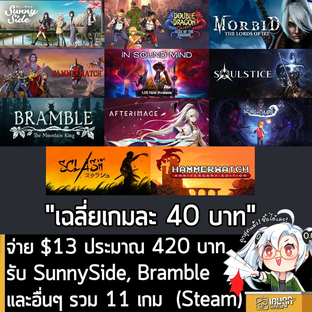 แพ็ครวมเกมต่างๆ จากค่าย Maximum Entertainment เกมเด่นๆ ก็ Hammerwatch ทั้ง 2 ภาค, AfterImage, Bramble, In Sound Mind, SunnySide, Double Dragon Gaiden แพ็คนี้ Tier 3 ก็ราคาเกมละประมาณ 40 บาท แต่คุ้มสุดจริงๆ คือ Tier 1 จ่าย $5 ได้ 5 เกมนี่ล่ะ