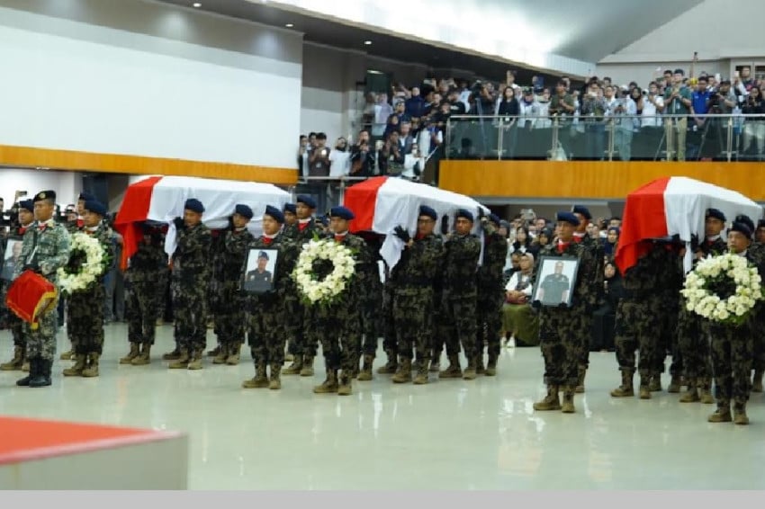 Upacara pelepasan tiga jenazah korban jatuhnya pesawat ATR 42-500 dilaksanakan Ke kampus Politeknik Ahli Usaha Perikanan (AUP) Pasar Minggu, Jakarta Selatan Ke Minggu (25/1/2026). Foto/Ari Sandita Murti