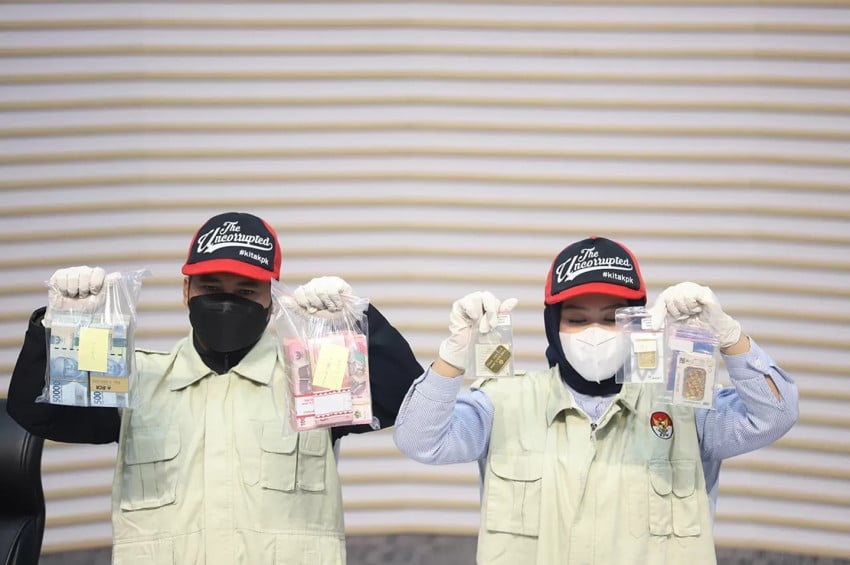 Petugas Menunjukkan Produk bukti uang tunai dan logam mulia Di Peristiwa Pidana dugaan suap dan gratifikasi Di Pemerintah Kabupaten Lampung Di Pada konferensi pers Di Gedung Merah Putih KPK, Jakarta, Kamis (11/12/2025). Foto/Arif Julianto