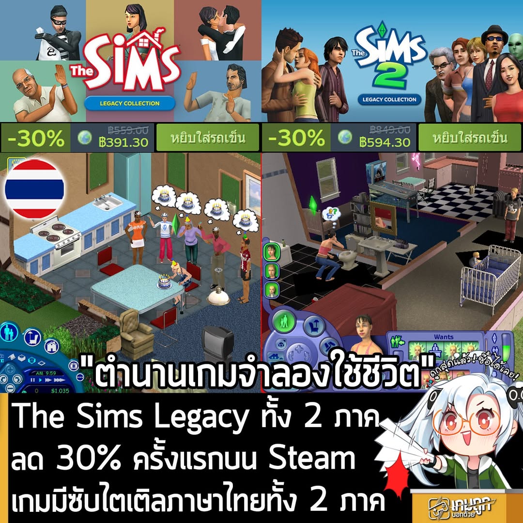 ลด 30% ครั้งแรกของเกมนี้บน Steam ส่วนตัวเกมก็ 2 ภาคแรกของเกมจำลองการใช้ชีวิตซีรีส์ The Sims ที่ครองใจแฟนๆ มานาน ทั้ง 2 ภาคมีภาษาไทยเวอร์ชันดั้งเดิมที่แปลโดย คุณอิศเรศ ทองปัสโณว์ ซึ่งแปลดีมากๆ แม้ว่าช่วงวันแรกๆ เกมจะมีปัญหาเยอะยับหมา แต่ตอนนี้อัปเดตแก้ไขจนเล่นได้ดีมากๆ แล้ว ใครที่อยากจะซื้อเก็บไว้เล่นรำลึกความหลัง ก็จัดกันไป