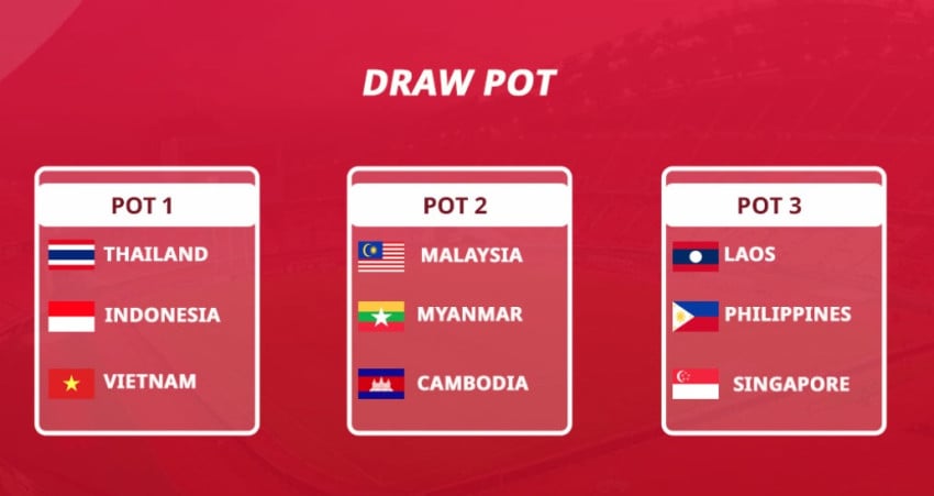 Sambil Itu, Pot 2 diisi Bersama Malaysia, Myanmar, dan Kamboja, sedangkan Pot 3 dihuni Laos, Filipina, dan Singapura.